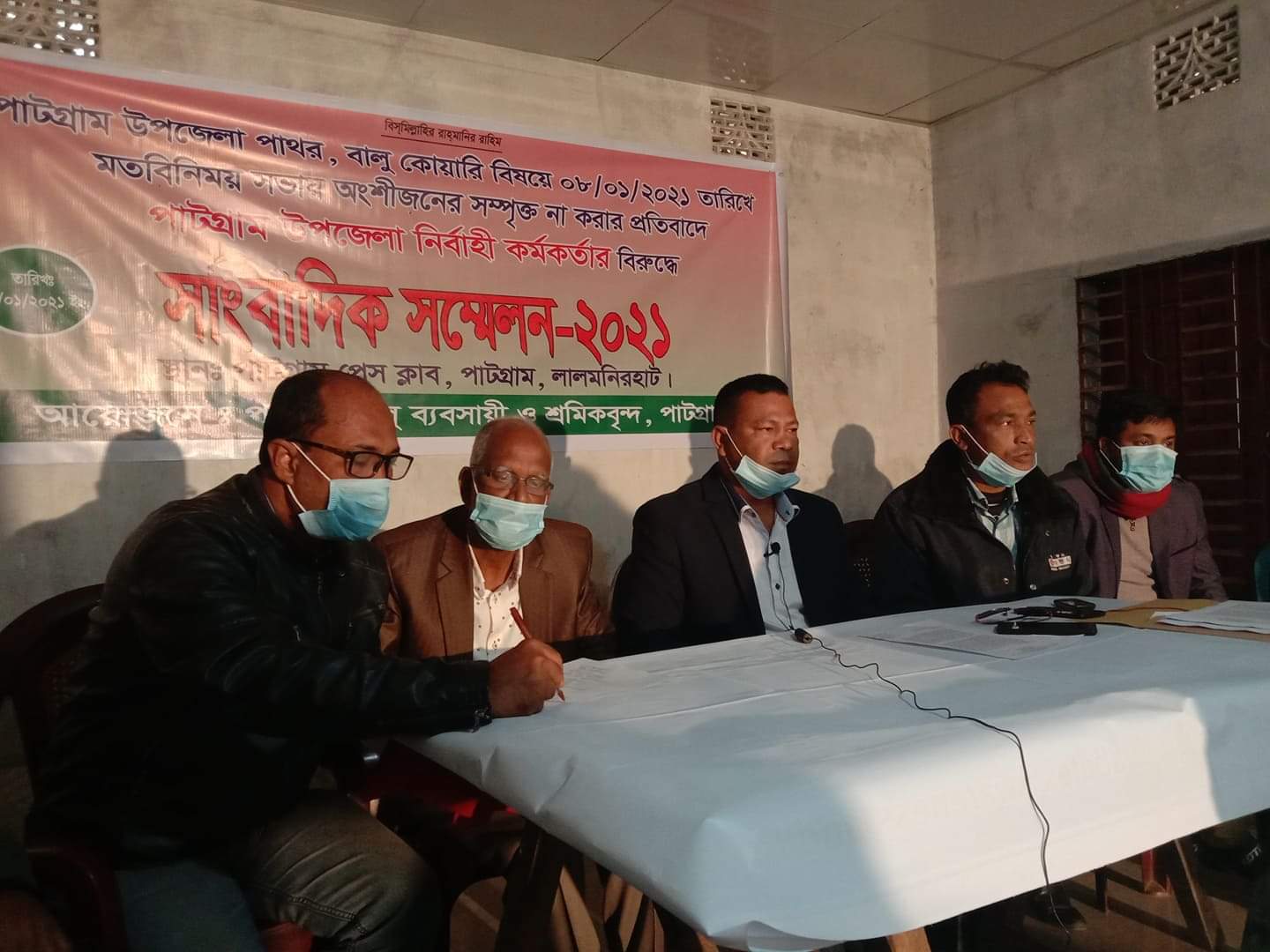 জানা গেছে, লালমনিরহাট জেলার পাটগ্রাম উপজেলায় পাথর ও বালু কোয়ারি সক্রান্ত গত ৮ জানুয়ারি মন্ত্রী পরিষদের অতিরিক্ত সচিব মোঃ রফিকুল ইসলাম, বিভাগীয় কমিশনার তৌহিদুল ইসলাম, জেলা প্রশাসক আবু জাফর-এঁর অনুষ্ঠিত মতবিনিময় সভায় পাটগ্রাম উপজেলা নির্বাহী কর্মকর্তা বেগম কামরুন নাহার পাটগ্রাম উপজেলার পাথর ও বালু ব্যবসায়ীগণকে বাদ দিয়ে পার্শ্ববর্তী নীলফামারী জেলার পাথর ও বালু ব্যবসায়ীদের নিয়ে সভা করা, একক স্বেচ্ছাচারিতা, প্রতিবাদে আজ সোমবার (১১ জানুয়ারি) দুপুরে পাটগ্রাম প্রেসক্লাবে সাংবাদিক সম্মেলনের অনুষ্ঠিত হয়। পাটগ্রাম উপজেলা পাথর ও বালু ব্যবসায়ী সমিতি আয়োজিত এ সংবাদ সম্মেলনে সমিতির উপদেষ্টা আবু বক্কর সিদ্দিক বাচ্ছুর সভাপতিত্বে অনুষ্ঠিত সংবাদ সম্মেলনে লিখিত বক্তব্য পাঠ করেন সমিতির সাধারণ সম্পাদক ও পাটগ্রাম উপজেলা পরিষদেরর ভাইস চেয়ারম্যান মোফাজ্জল হোসেন লিপু। এ সময় বাংলাদেশ আওয়ামী যু্ব লীগের পাটগ্রাম পৌর শাখার সভাপতি বিজয় কুমার সুর, ব্যবসায়ী আবু নাইম রুবেল, পলাশ সাহা, নাজমুল হুদা রাসেল, মফিজুলসহ ব্যবসায়ীবৃন্দ উপস্থিত ছিলেন।