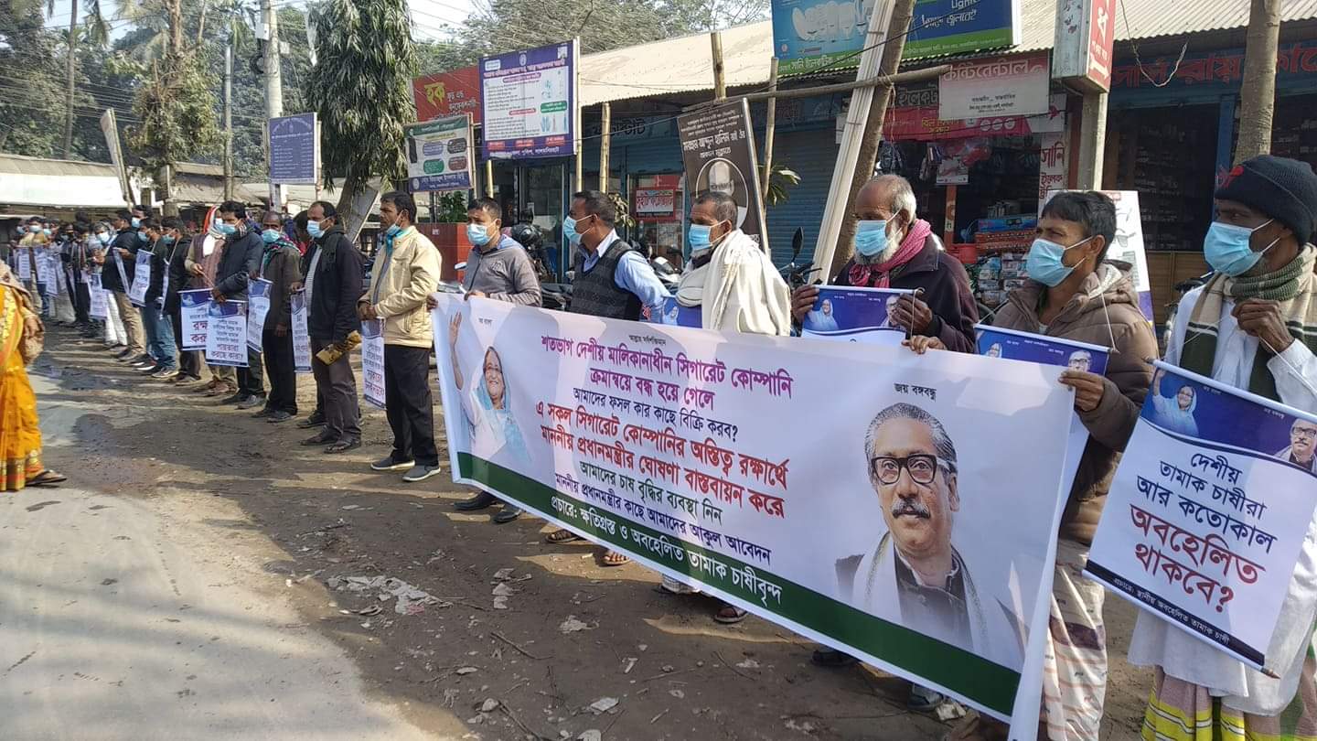 মানববন্ধনে তামাক চাষীরা প্রধানমন্ত্রীর কাছে দেশীয় সিগারেট কোম্পানির অস্তিত্ব রক্ষার দাবী জানান।