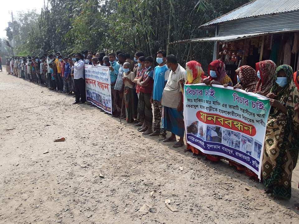 আলোর মনি ডটকম ডেস্ক রিপোর্ট: আজ শনিবার (২৭ ফেব্রুয়ারি) সকাল ১১টা ৩০মিনিটে রাজারহাটের ঘরিয়াল ডাংগা ইউনিয়নের ১নং ওয়ার্ডের সুলতান বাহাদুর মিয়াপাড়া স্কুল মাঠ সংলগ্ন সড়কে এলাকাবাসীর আয়োজনে আঃ হাকিম, হামিদ ও জাহিদের ভাড়াটিয়া সন্ত্রাসীদের দ্বারা একরামুল হকের বাড়ীতে হামলাকারীদের সু-বিচারের দাবীতে মানববন্ধন অনুষ্ঠিত হয়।