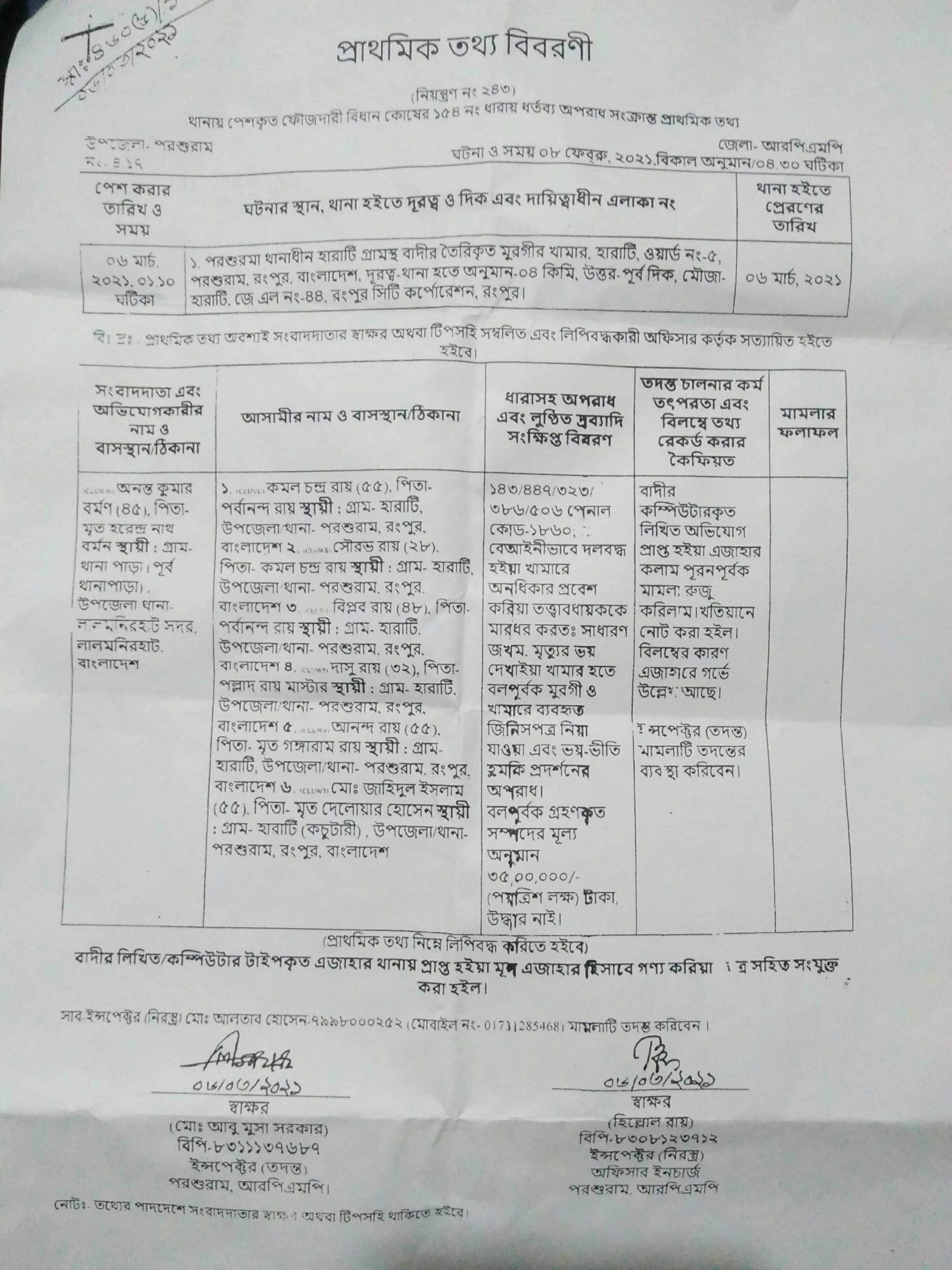 মামলার আসামীরা হলেন- কমল চন্দ্র রায়, সৌরভ রায়, বিপ্লব রায়, দাসু রায়, আনন্দ রায়, জাহিদুল ইসলাম সকলেই একই গ্রামের বাসিন্দা।