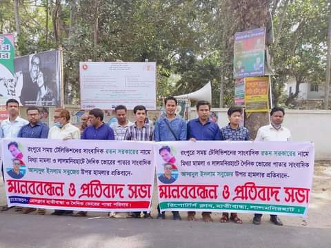 আলোর মনি ডটকম ডেস্ক রিপোর্ট: রংপুরে সময় টেলিভিশনের সাংবাদিক রতন সরকারের নামে মিথ্যা মামলা ও লালমনিরহাটে দৈনিক ভোরের পাতার সাংবাদিক আসাদুল ইসলাম সবুজের উপর হামলার প্রতিবাদে লালমনিরহাট জেলায় মানববন্ধন ও প্রতিবাদ সভা করেছেন সাংবাদিকবৃন্দ।