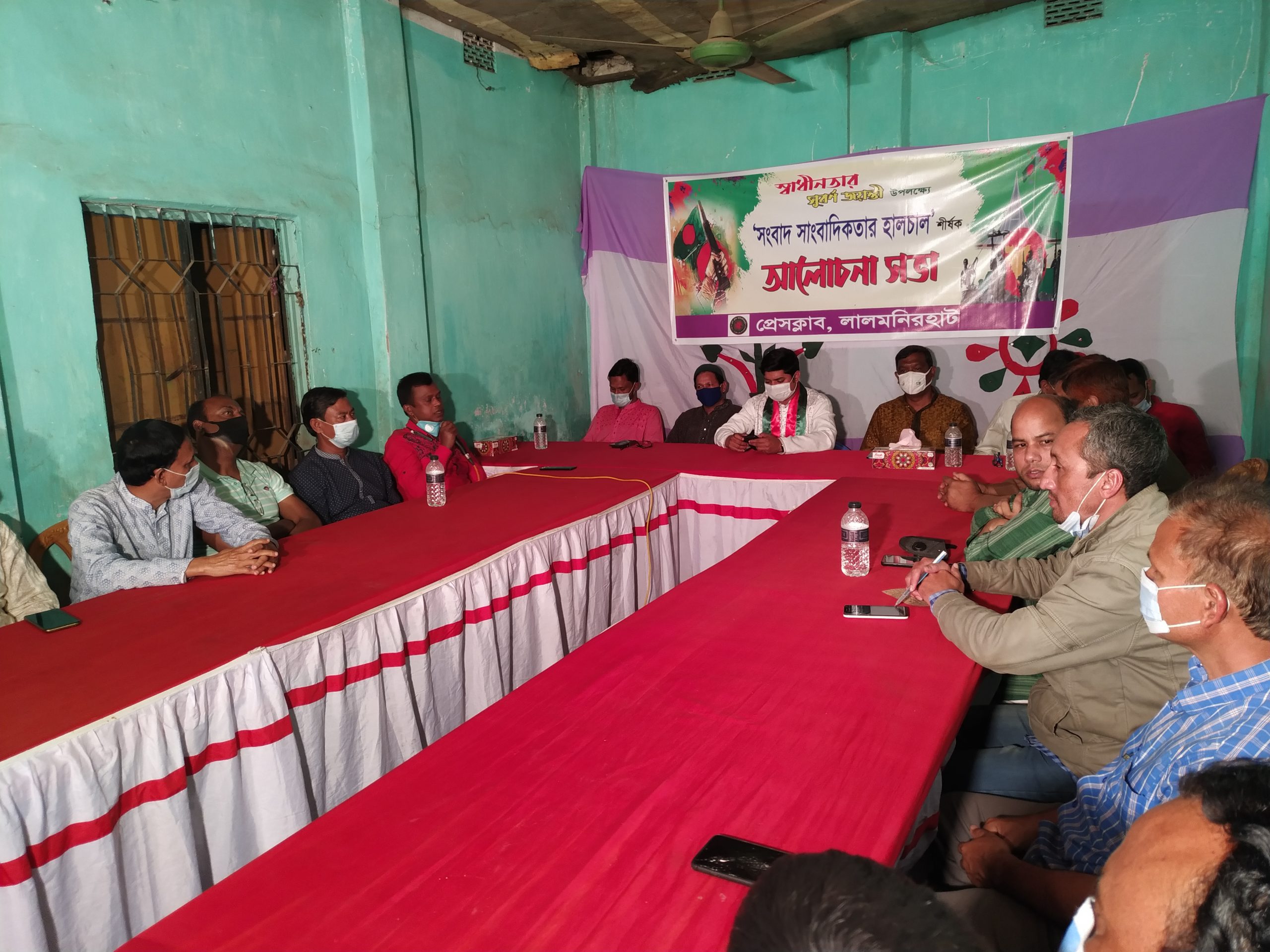 সভাপতিত্ব করেন লালমনিরহাট প্রেসক্লাবের সভাপতি মোফাখখারুল ইসলাম মজনু। বক্তব্য রাখেন আদিতমারী প্রেসক্লাবের সাধারণ সম্পাদক সুলতান হোসেন, বাংলা নিউজ প্রতিনিধি খোরশেদ আলম সাগর, কালীগঞ্জ প্রেসক্লাবের সাধারণ সম্পাদক লিটন পারভেজ, লালমনিরহাট প্রেসক্লাবের সাংগঠনিক সম্পাদক মোয়াজ্জেম হোসন, কালীগঞ্জ প্রেসক্লাবে নব-নির্বাচিত সাধারণ সম্পাদক তিতাস আলম, লালমনিরহাট প্রেসক্লাবের দপ্তর সম্পাদক হায়দার আলী বাবু, প্রচার সম্পাদক মিজানুর রহমান দুলাল, সমাজ কল্যাণ ও সেমিনার বিষয়ক সম্পাদক এসকে সাহেদ, কার্যকারী সদস্য তন্ময় আহমেদ নয়ন, সাপ্তাহিক আলোর মনি পত্রিকার সম্পাদক মাসুদ রানা রাশেদ, ক্যাবল অপারেটর ব্যবসায়ী এসকে টিপু সুলতান, আদিতমারী প্রেসক্লাবের সভাপতি ফরহাদ আলম সুমন, লালমনিরহাট প্রেসক্লাবের সাধারণ সম্পাদক আশিকুর রহমান ডিফেন্স, কালীগঞ্জ প্রেসক্লাবের সভাপতি আমিরুল ইসলাম হেলাল, এনটিভির সিনিয়র স্টাফ রিপোর্টার একেএম মঈনুল হক মঈন প্রমুখ। এ সময় লালমনিরহাটের কর্মরত সাংবাদিকবৃন্দ উপস্থিত ছিলেন। সঞ্চালক লালমনিরহাট প্রেসক্লাবের যুগ্ম সাধারণ সম্পাদক মাজেদ মাসুদ।