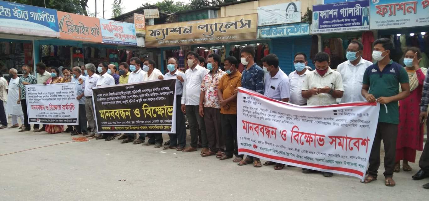 আলোর মনি রিপোর্ট: বুধবার (১১ আগস্ট) বিকাল ৪টায় শ্রীশ্রী গৌরী শঙ্কর গোশালা সোসাইটি লালমনিরহাট চত্ত্বরে বাংলাদেশ হিন্দু-বৌদ্ধ-খ্রিস্টান ঐক্য পরিষদ লালমনিরহাট জেলা শাখার আয়োজনে খুলনার রূপসায় শিয়ালী গ্রামের হিন্দুপাড়ায়, পটুয়াখালী কলাপাড়ার রাখাইন এলাকায়, মৌলভীবাজার কুলাউড়ার অধিবাসীসহ দেশের নানান স্থানে ধর্মীয় জাতিগত সংখ্যালঘুদের উপর সাম্প্রদায়িক হামলা, ভাংচুর, লুটপাট ও ভূমি জবর দখলের প্রতিবাদে- মানববন্ধন ও বিক্ষোভ সমাবেশ অনুষ্ঠিত হয়।