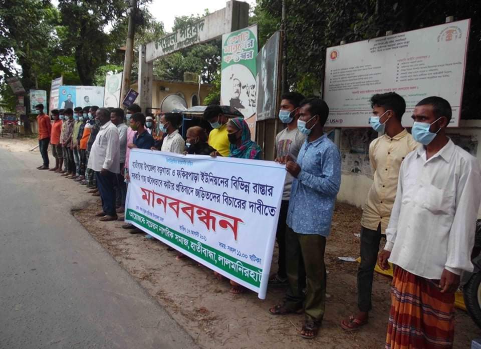 মঙ্গলবার (১৭ আগস্ট) সকালে উপজেলা পরিষদ গেটে ঘন্টাব্যাপী মানববন্ধনে বড়খাতা ও ফকিরপাড়া দুই ইউনিয়নের শতাধিক নারী ও পুরুষ অংশ নেয়। এ সময় বক্তব্য রাখেন উপজেলা আওয়ামী সেচ্ছাসেবক লীগের সাধারণ সম্পাদক সুলতান আহম্মেদ রাজন, আব্দুর রহমান ও হাবিবুর রহমান। বক্তাগন বলেন, বড়খাতা ইউনিয়ন চেয়ারম্যান আবু হেনা মোস্তফা জামাল সোহেল ঐ দুই ইউনিয়নের দেড় শতাধিক বিভিন্ন প্রজাতের গাছ অবৈধ ভাবে কেটে বিক্রি করেছে। এ ঘটনার প্রতিবাদ করা হলে চেয়ারম্যান ও তার লোকজন বিভিন্ন ভাবে হুমকি দিচ্ছেন। অবৈধ গাছ কাটার বিরুদ্ধে স্থানীয় থানাসহ জেলা ও উপজেলা প্রশাসনের নিকট একাধিক লিখিত অভিযোগ করা হয়েছে। কিন্তু দীর্ঘ দিন অতিবাহিত হলেও প্রশাসন রহস্যজনক কারণে আইনগত ব্যবস্থা গ্রহন করছে না।
