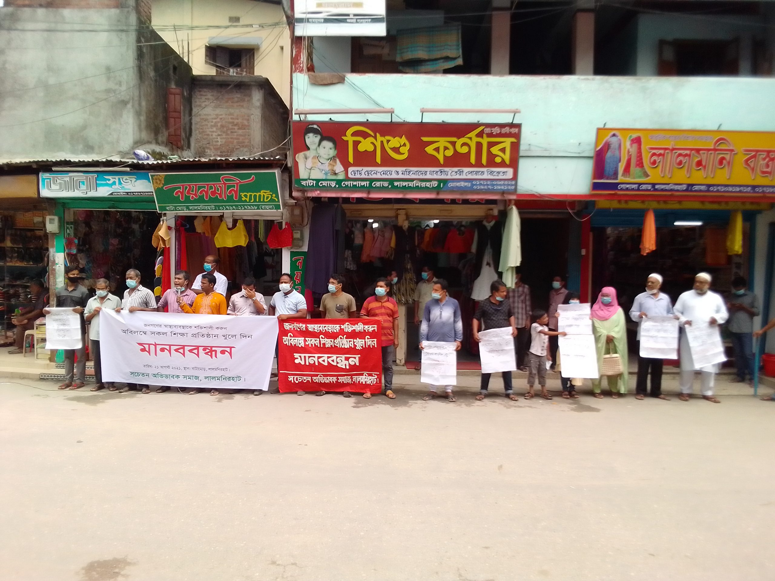 আলোর মনি রিপোর্ট: শনিবার (২১ আগস্ট) সকাল ১১টায় লালমনিরহাট জেলা শহরের বাটা মোড়ে সচেতন অভিভাবক সমাজ লালমনিরহাটের আয়োজনে জনগণের স্বাস্থ্য ব্যবস্থাকে শক্তিশালী করুন অবিলম্বে সকল শিক্ষা প্রতিষ্ঠান খুলে দিন দাবীতে মানববন্ধন অনুষ্ঠিত হয়।
