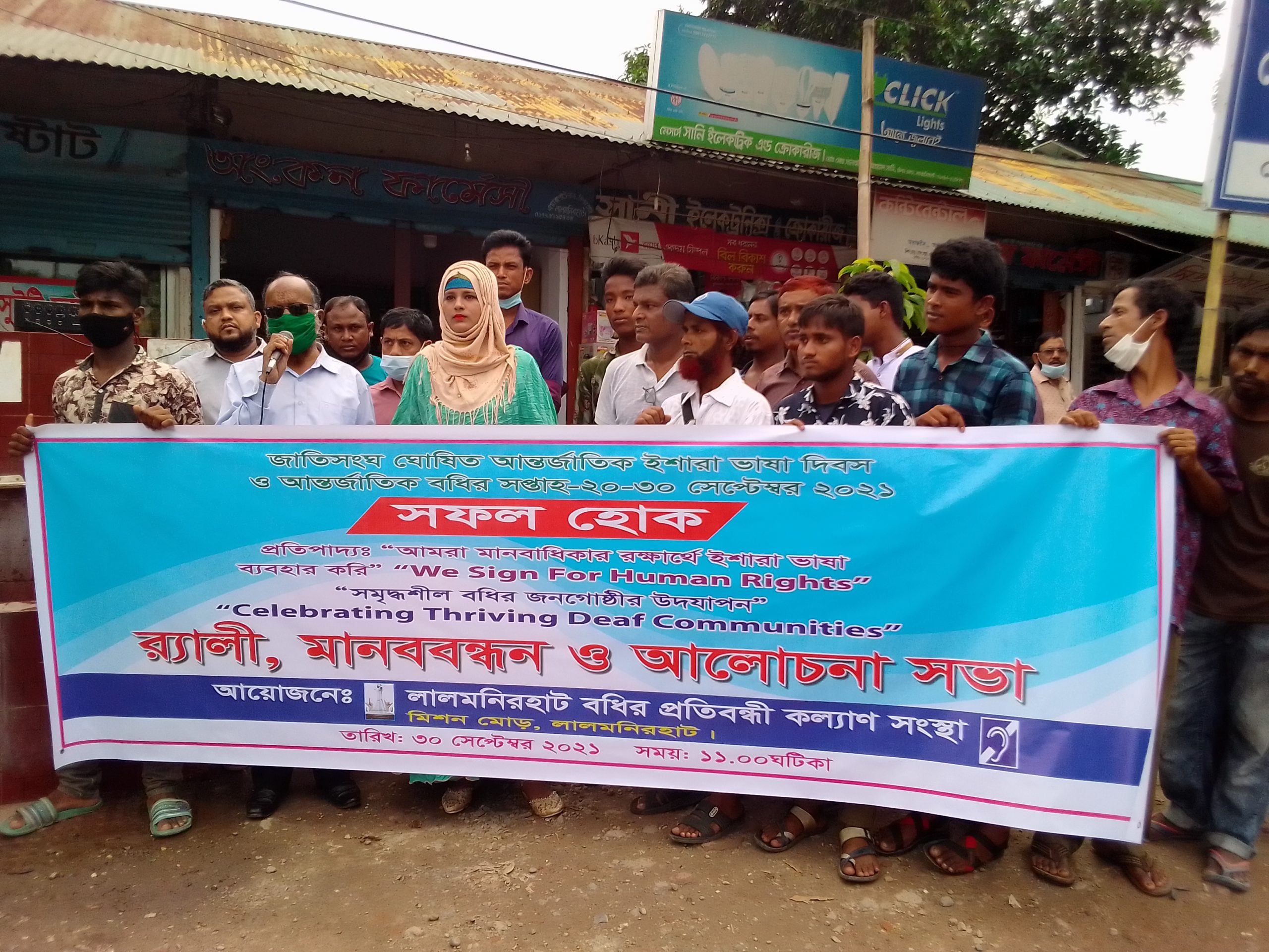 আলোর মনি রিপোর্ট: বৃহস্পতিবার (৩০ সেপ্টেম্বর) সকাল ১১টায় লালমনিরহাট জেলা শহরের প্রাণকেন্দ্র মিশন মোড় চত্ত্বরে লালমনিরহাট বধির প্রতিবন্ধী কল্যাণ সংস্থার আয়োজনে জাতিসংঘ ঘোষিত আন্তর্জাতিক ইশারা ভাষা দিবস ও আন্তর্জাতিক বধির সপ্তাহ-২০২১ রালি, মানববন্ধন ও আলোচনা সভা অনুষ্ঠিত হয়।
