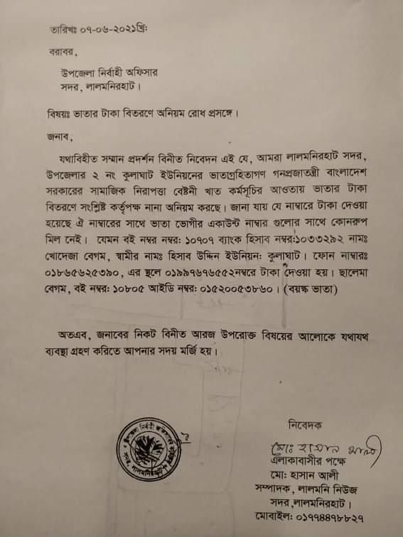 লালমনিরহাট জেলা প্রশাসন থেকে যদিও বলা হয়েছে যে, নির্ধারিত সময়ের মধ্যেই বয়স্ক, বিধবা ও প্রতিবন্ধী ভাতার টাকা বিতরণের কথা, কিন্তু এখনও ভাতার টাকা পাননি শতাধিক ভাতাভোগী।