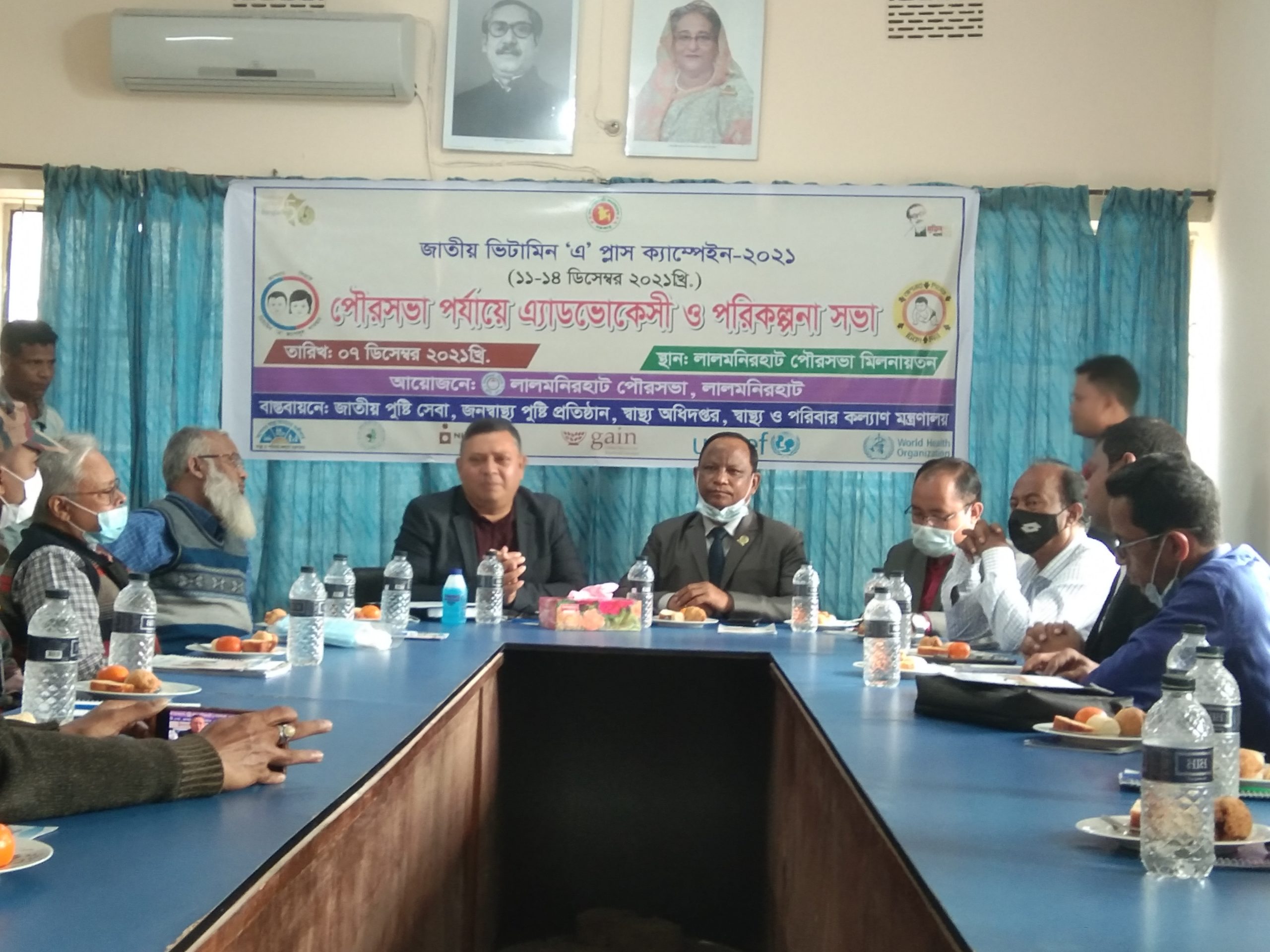 আলোর মনি রিপোর্ট: মঙ্গলবার (৭ ডিসেম্বর) সকাল ১০টায় লালমনিরহাট পৌরসভা মিলনায়তনে লালমনিরহাট পৌরসভার আয়োজনে জাতীয় পুষ্টি সেবা, জনস্বাস্থ্য পুষ্টি প্রতিষ্ঠান, স্বাস্থ্য অধিদপ্তর, স্বাস্থ্য ও পরিবার কল্যাণ মন্ত্রণালয়ের বাস্তবায়নে জাতীয় ভিটামিন 'এ' প্লাস ক্যাম্পেইন-২০২১ (১১-১৪ ডিসেম্বর ২০২১খ্রি.) পৌরসভা পর্যায়ে এ্যাডভোকেসী ও পরিকল্পনা সভা অনুষ্ঠিত হয়।