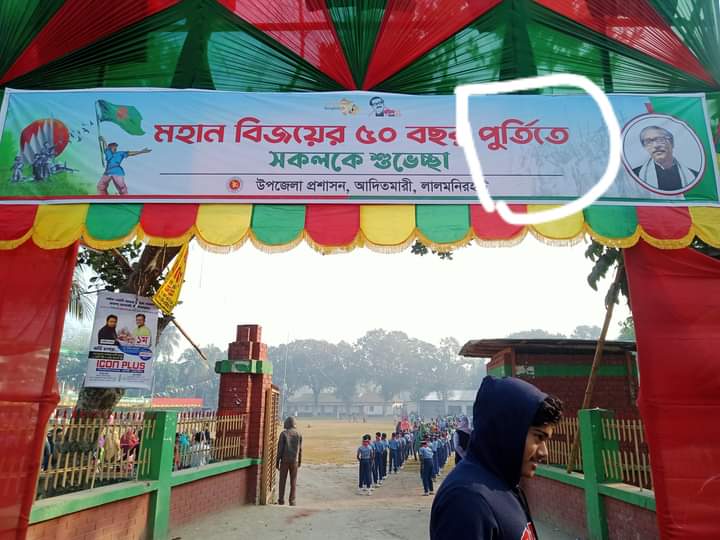 দেখা যায়, ওই গেটের লেখায় ভুল চিহ্নিত হয়েছে। সেখানে ‘মহান বিজয়ের ৫০ বছর পূর্তিতে সকলকে শুভেচ্ছা’ লেখার বদলে লেখা হয়েছে ‘মহান বিজয়ের ৫০ বছর পুর্তিতে সকলকে শুভেচ্ছা’।
