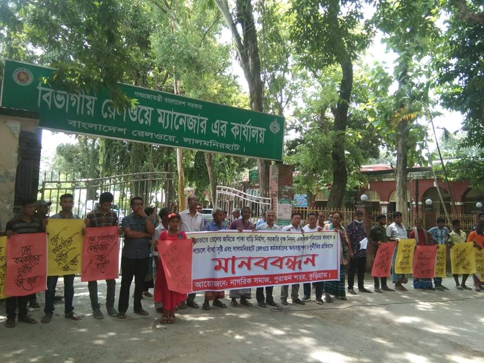 বুধবার (৩ আগস্ট) দুপুর ১২টায় বাংলাদেশ রেলওয়ে লালমনিরহাট বিভাগীয় রেলওয়ে ম্যানেজার এর কার্যালয় চত্ত্বরে নাগরিক সমাজ পুরাতন শহর কুড়িগ্রামের আয়োজনে এ মানববন্ধন অনুষ্ঠিত হয়।