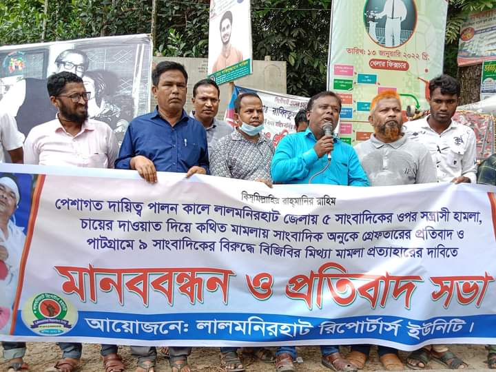 লালমনিরহাটে পেশাগত দায়িত্ব পালন কালে লালমনিরহাট জেলায় ৫ সাংবাদিকের ওপর সন্ত্রাসী হামলা, চায়ের দাওয়াত দিয়ে কথিত মামলায় সাংবাদিক অনুকে গ্রেফতারের প্রতিবাদ ও পাটগ্রামে ৯ সাংবাদিকের বিরুদ্ধে বিজিবির মিথ্যা মামলা প্রত্যাহারে দাবিতে মানববন্ধন ও প্রতিবাদ সভা অনুষ্ঠিত হয়েছে।